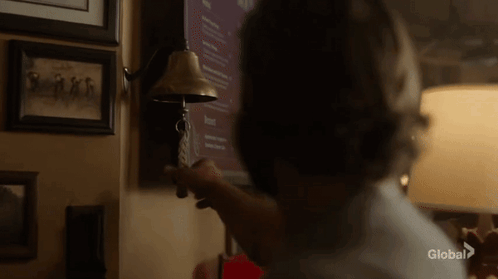 a man is ringing a bell on a wall in a room .