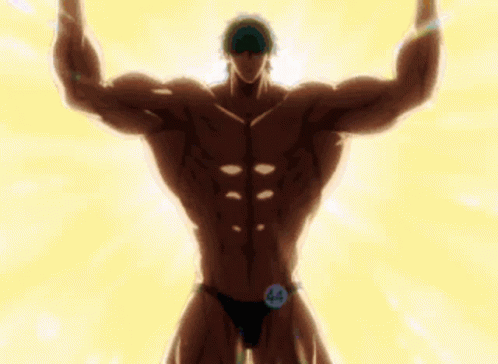 An incredibly muscular anime bodybuilder poses on stage, glowing brightly, as an awestruck audience watches.