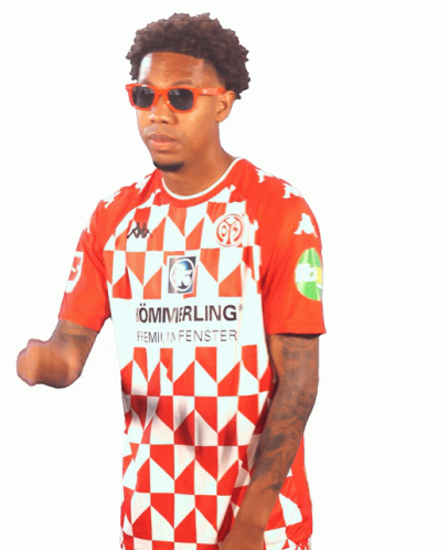 Jean Paul Boetius, wearing a red and white Mainz 05 jersey, playfully adjusts his red sunglasses.