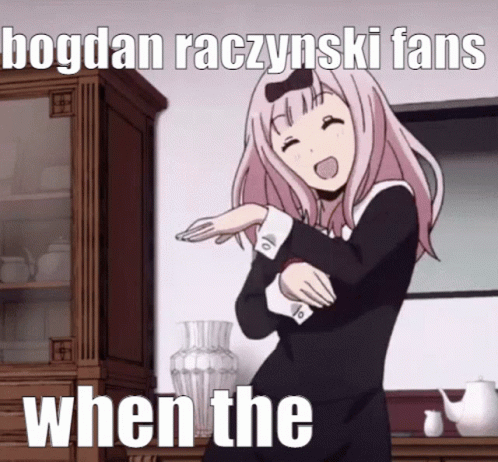 A meme featuring Bogdan Raczynski and an anime character, depicting 'Bogdan Raczynski fans when the...'