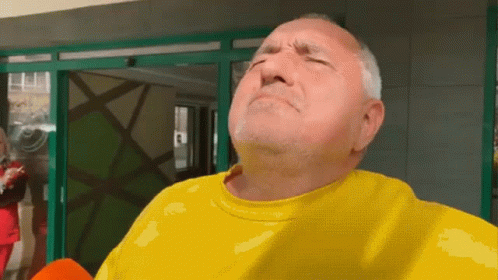 Bulgarian politician Boyko Borisov makes a distinctive facial expression while wearing a bright yellow shirt.
