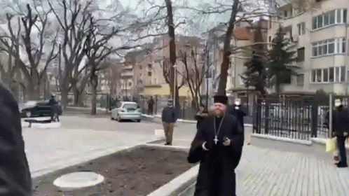 Boyko Borisov is greeted by a clergyman in a black robe, exchanging a friendly greeting outdoors.