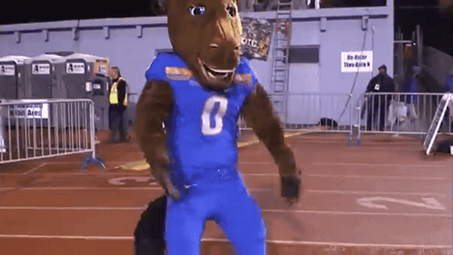 Boise State Broncos mascot Buster dancing on the track in a blue jersey with the number 0.