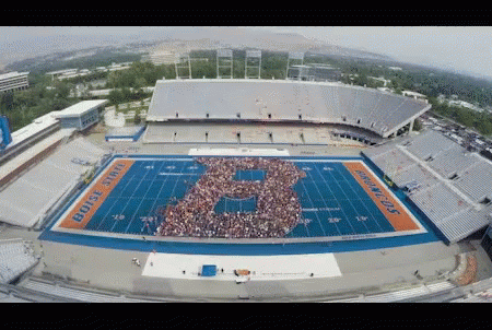 Aerial view of Boise State's iconic blue turf football stadium, with a large 'B' formation of people on the field.