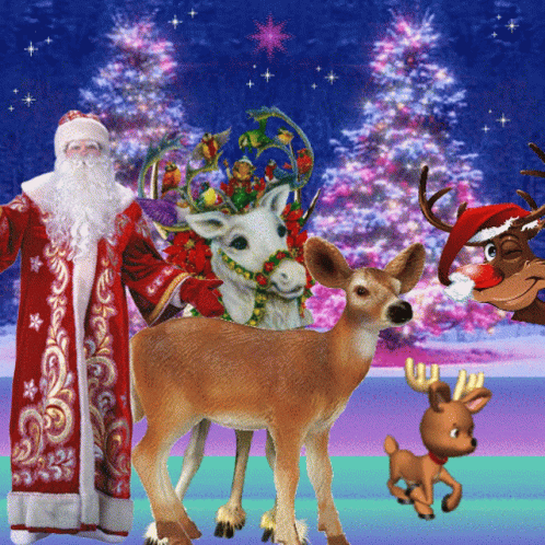 Santa Claus and deer celebrating Christmas with festive decorations and sparkling trees under a starry night sky.