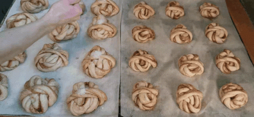 Preparing traditional Norwegian skillingsboller (cinnamon buns) by sprinkling sugar on unbaked dough.
