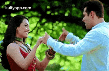 Salman Khan and Rani Mukherjee share a romantic moment in a beautiful outdoor setting.