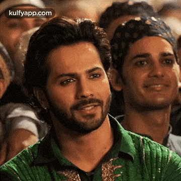 Bollywood actor Varun Dhawan smiles charmingly in a green embroidered shirt, amidst a crowd.