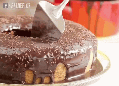 A delicious Bolo de Chocolate cake with chocolate frosting and sprinkles is cut and served.