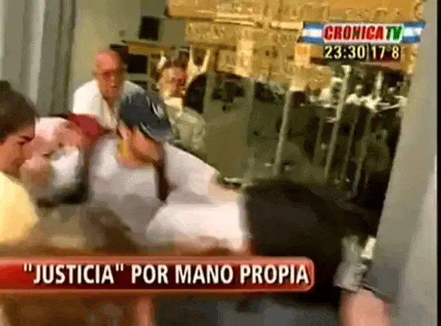 A man in a yellow shirt gets unexpectedly smacked in the face with a large fish, resulting in a messy splash.