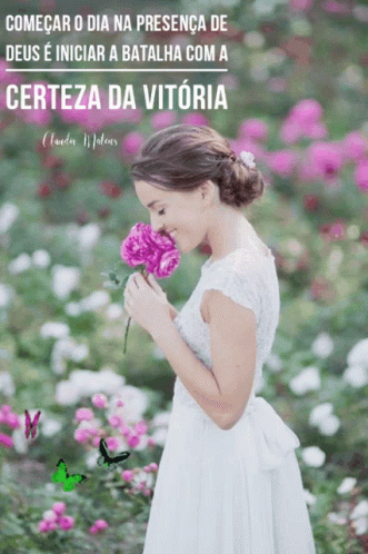 Woman in a white dress smelling a pink flower, accompanied by an inspirational message by Claudia Mateus.