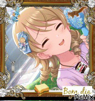 Nono Morikubo from Idolmaster Cinderella Girls smiles, framed by an ornate border, with a fan, sandwich, and Nutella jar. Good morning!