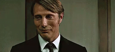 Mads Mikkelsen as Hannibal Lecter smiles, wishing 'Bon appétit' in a suit and tie.