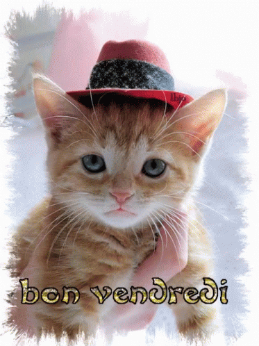 Adorable kitten wearing a hat with "Bon Vendredi" written on it, wishing a good Friday.