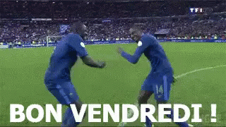 Two soccer players celebrate on the field with a dance, wishing everyone a 'Bon Vendredi!' (Happy Friday!).