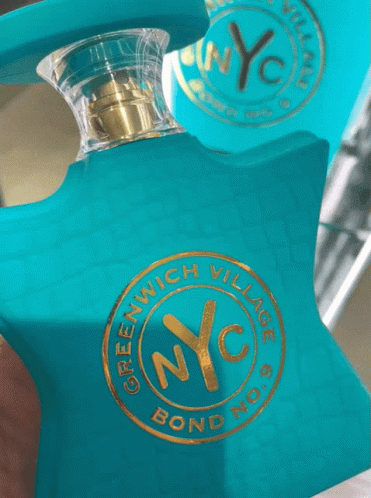 A close-up of the iconic turquoise Bond No. 9 Greenwich Village perfume bottle with its distinctive gold label.