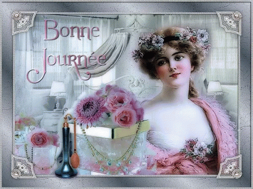 Woman with flowers on her head, wishing a good day with the French phrase 'Bonne Journée'.