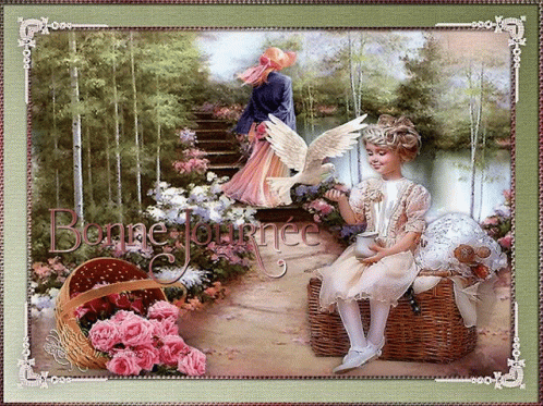 Animated painting of a cute angel girl on a wicker basket with 'BONNE JOURNEE' text, sparkling.