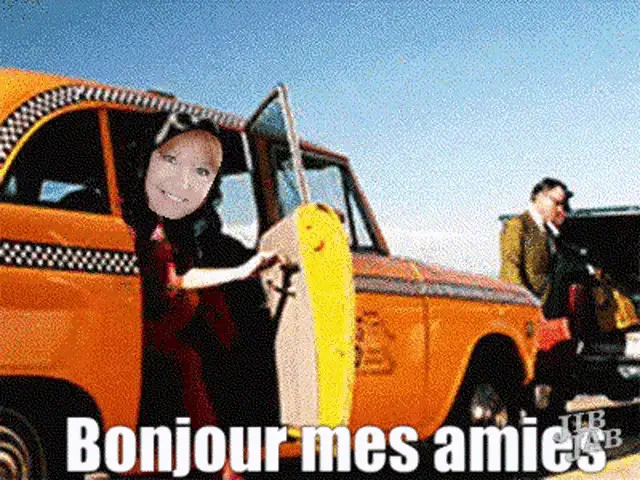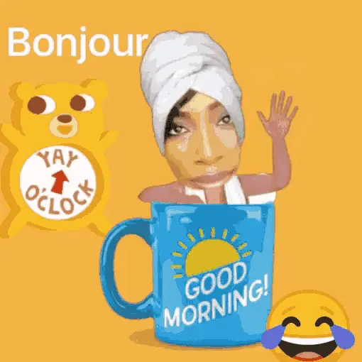 Jayjay, a cartoon man with glasses, sips tea from a cup with 'BONJOUR' text in the background.