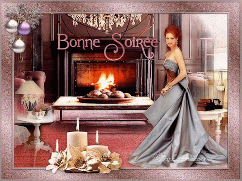A woman in a long dress stands by a fireplace, illuminated by candles, with 'Bonne Soirée' text.