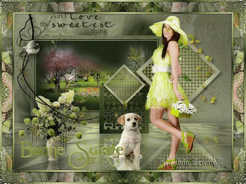 Lady in a green dress and hat with a cute puppy, embodying the sweetest love and a good evening greeting.