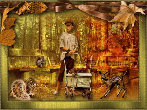 Boy pushing a stroller with a fawn, surrounded by deer and squirrels in an autumn forest. Features 'Bonne Soirée' text.