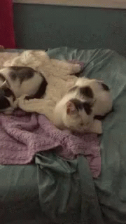 A black and white kitten gets startled while resting on a bed with other cats.