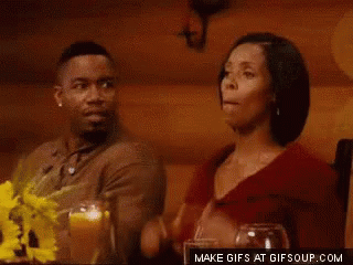 A woman animatedly talks and gestures, pointing at a man sitting across from her at a table, as he listens intently.
