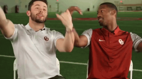 Two men on a football field making a heart gesture, celebrating Boomer Sooner spirit.
