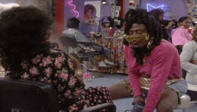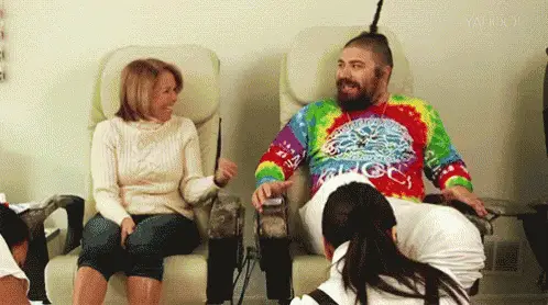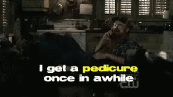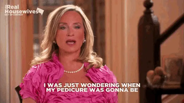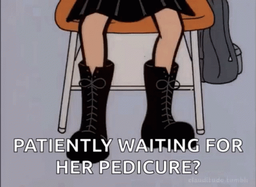 Cartoon girl in black boots and skirt patiently waiting for her pedicure appointment.