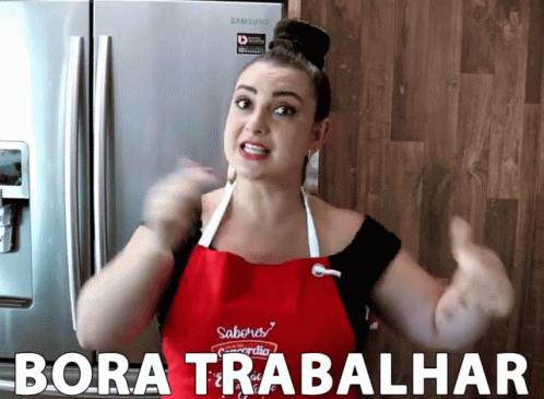 A woman in a red apron with 'Sabores Concordia' logo encourages viewers to 'Bora Trabalhar' (Let's Work).