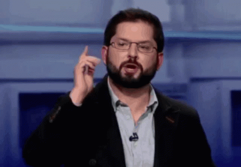 Gabriel Boric, wearing glasses and a beard, speaks and gestures during an event.