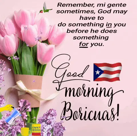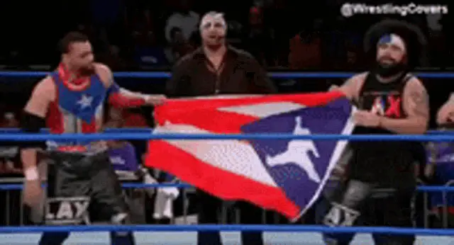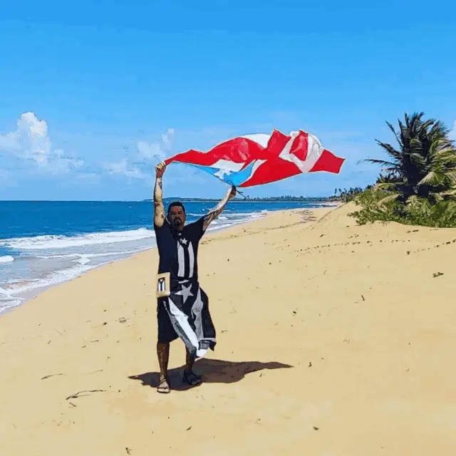 A proud Boricua father and his young son, both in traditional attire, display their Puerto Rican flags.