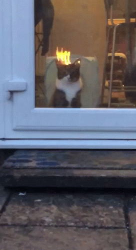 A calm cat appears to have its head on fire due to a reflection, looking bored while sitting by a window.