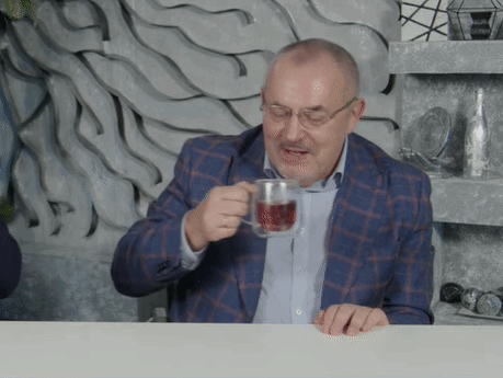 Борис Надеждин, a man in a plaid suit, sips tea from a clear glass, looking thoughtful.