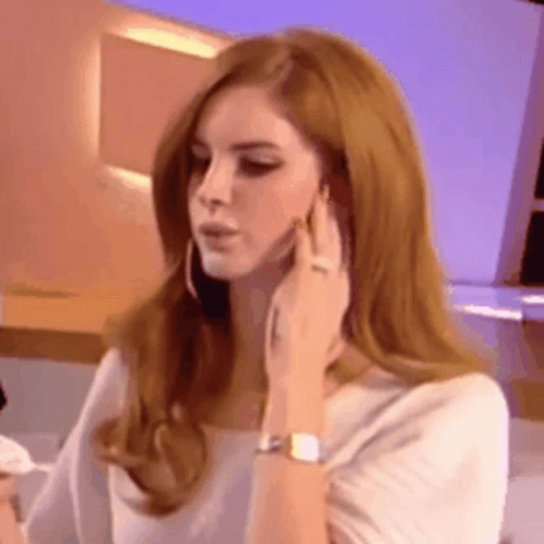 Lana Del Rey, known for 'Born To Die', makes a 'shush' gesture with her finger to her lips, wearing a white top.