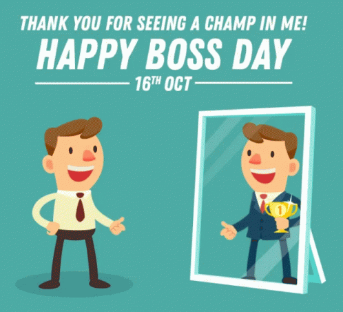 A cartoon man gives a thumbs up to his reflection, celebrating Happy Boss Day on October 16th.