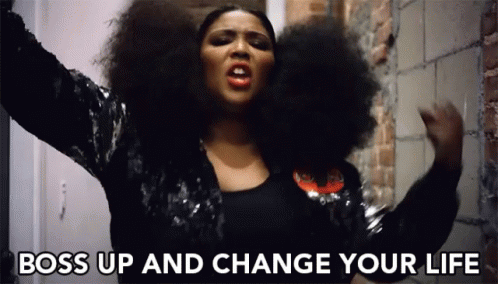 Lizzo, with a big afro, powerfully declares 'Boss Up and Change Your Life' in a motivational moment.