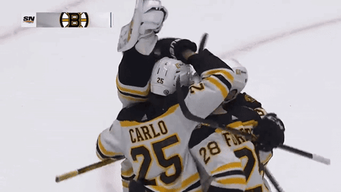 Boston Bruins players, including Linus Ullmark, Carlo, and Forbort, celebrate a goal on the ice.