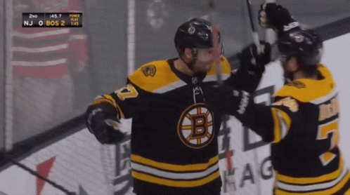 a hockey player with the letter b on his jersey hugs another player