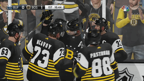 Boston Bruins players, including Patrice Bergeron, McAvoy, and Pastrnak, celebrate a goal against Buffalo.