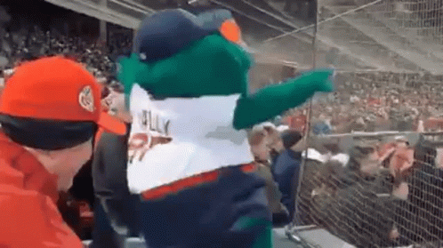 Boston Red Sox mascot Wally The Green Monster interacts with fans at a baseball game, creating an energetic atmosphere.