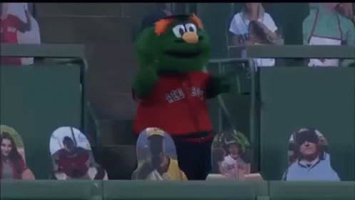 Wally The Green Monster, the Boston Red Sox mascot, dances energetically in the stands of a baseball stadium.