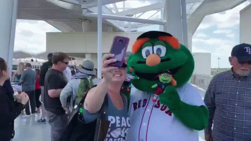 A fan takes a joyful selfie with Wally The Green Monster, the beloved Boston Red Sox mascot.