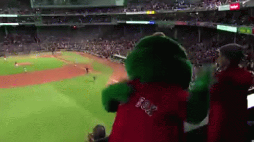 Wally the Green Monster, the Boston Red Sox mascot, enthusiastically cheers and pounds his chest at a baseball game.