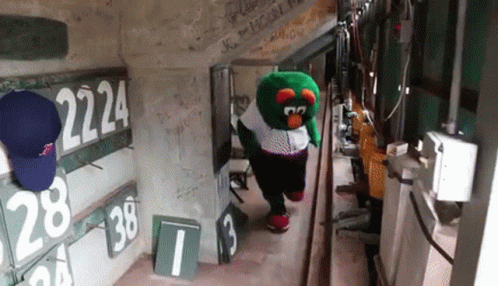 Wally The Green Monster, the Boston Red Sox mascot, gets ready for a game by putting on his baseball cap.