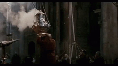 The massive Botafumeiro censer swings through a grand cathedral, filling the air with incense smoke.