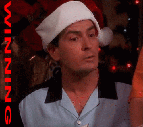Charlie Sheen in a Santa hat with 'WINNING' text, looking surprised during Christmas.