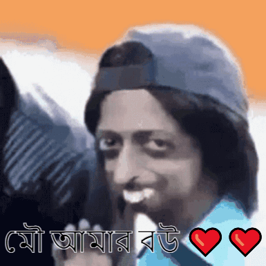 Man in a cap smiles with a funny expression, with the Bengali text 'Mou is my wife' and hearts.