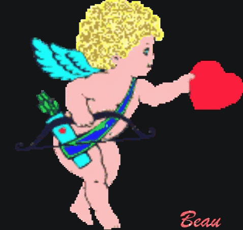 Pixel art cupid, signed by Beau, with a bow and arrow, holding out a red heart, associated with Boulenin Opely.